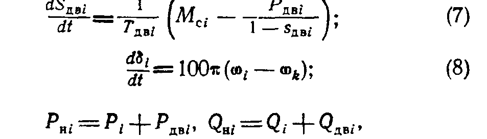 Qi—мощность нагрузки, заданная статическими характеристиками; Sдвi—скольжение двигателя.Кроме дифференциальных уравнений (7) и (8) необходимо записать уравнения баланса мощностей