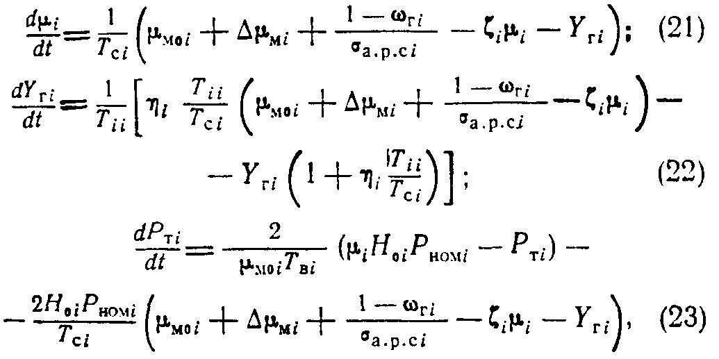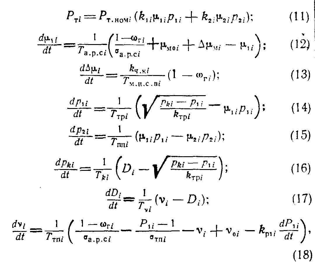 иi—постоянная времени сервомотора регулятора “до себя”, μπ.д.с—открытие регулирующих клапанов; Кpi — коэффициент усиления.Аналогичным образом может быть смоделирована тепловая турбина с барабанным котлоагрегатом, уравнения которого несколько отличаются от уравнений (11)—(20) и здесь не приводятся.