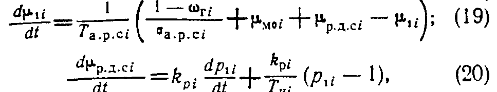 p1i, p2i, μ1i,μ2i—давление пара и открытие регулирующих клапанов цилиндров высокого и среднего давления (μ2i==const); pki—давление пара на выходе из котла; Di—количество пара, генерируемого котлом; Vi—обобщенный показатель, характеризующий подачу топлива, воды и воздуха в котел; σa.p.ci,σтпi—статизмы регуляторов скорости турбины и топливоподачи в котел;Kp1i — коэффициент усиления регулятора нагрузки котла по первой производной давления “свежего” пара; Ktpi—коэффициент, характеризующий потери давления в трубопроводе “свежего” пара; Tтрi, Tппi, Tа.р.с.i Tм.и.с.вi — постоянные времени трубопровода “свежего” пара, промперегревателя автоматического регулятора скорости турбины, двигателя изменения скорости вращения турбоагрегата; μм0i,Δμмi—управляющие сигналы системы вторичного регулирования частоты и мощности, выраженные в перемещении регулирующих клапанов турбины; Kч.кi— коэффициент частотной коррекции системы АРЧМ, K1i,K2i—доли мощности цилиндра высокого давленияи цилиндров среднего и низкого давления