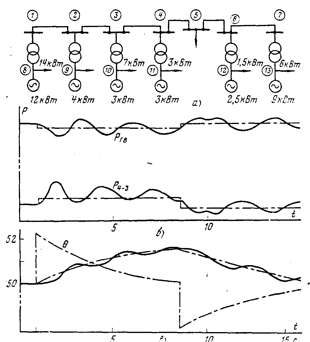 расчетная схема; б — графики изменения мощностей генераторов и перетока по связи; в—графики изменения частоты и ускорения системы; ———— — эксперимент; —— • —— — расчет.Значительное ускорение расчета второго этапа удается получить, применив метод осреднения “быстрых” переменных, к которым в этом случае относятся частота в системе, давления свежего и перегретого пара, положение регулирующих клапанов турбоагрегатов и направляющего аппарата гидротурбин. Применение этого метода, как показали проведенные исследования, не искажает топологическую картину пространства состояний исследуемой системы и в то же время позволяет значительно сократить число дифференциальных уравнений и увеличить шаг интегрирования [Л. 7].