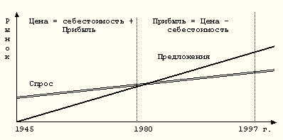В 1980 году в США (да и во всем мире “капитала”) произошел перелом соотношения спроса и предложения. Рынок стал конкурентным, то есть цена на продукцию стала рыночной. И для того, чтобы получить нужную прибыль для развития, предприятия должны были снижать себестоимость своей продукции.
