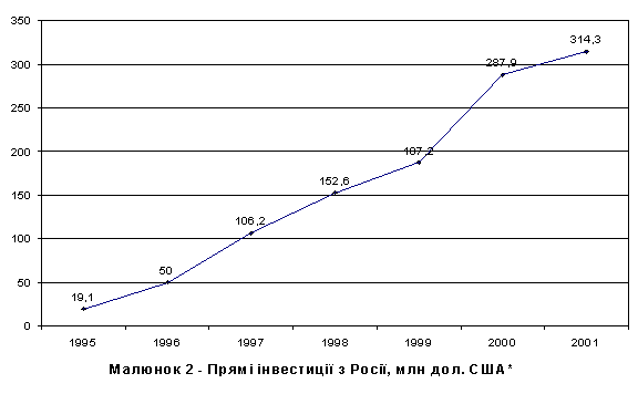 Також Росія посідає четверте місце після США, Кіпру і Нідерландів за обсягом прямих інвестицій до України. Як можна побачити з малюнку 2 розмір прямих інвестицій з Росії особливо збільшився у 2000 – 2001 рр.