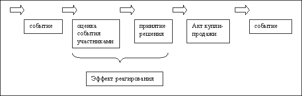 Из схемы (рис. 1) понятно, что акту купли-продажи предшествует принятие решения участниками рынка, которое в свою очередь зависит от оценки ими ситуации на рынке в целом или отдельного события (любого характера – внешнего или внутреннего). Предшествующее же событие было вызвано определенными действиями участников рынка в той же последовательности. Процесс оценки событий и принятия решений и составляет эффект реагирования. Акт купли-продажи является результатом предпочтения участников и отражается в предлагаемой им цене (цене спроса/предложения).