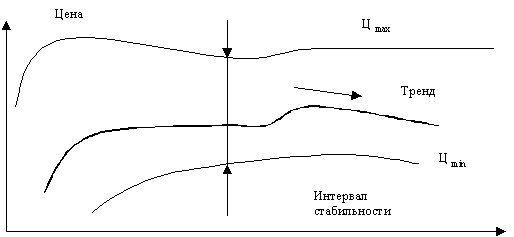 Полоса значений цен, ограниченная сверху максимальной ценой, снизу – минимальной ценой заключения сделки на день ее совершения, составляет интервал количественных значений, математическое ожидание которых и образует основной тренд. Следует заметить, что именно интервал значений определяет состояние рынка. Когда большинство участников рынка принимает решения с небольшим отклонением от основного тренда, уместно говорить о стабильности на рынке.