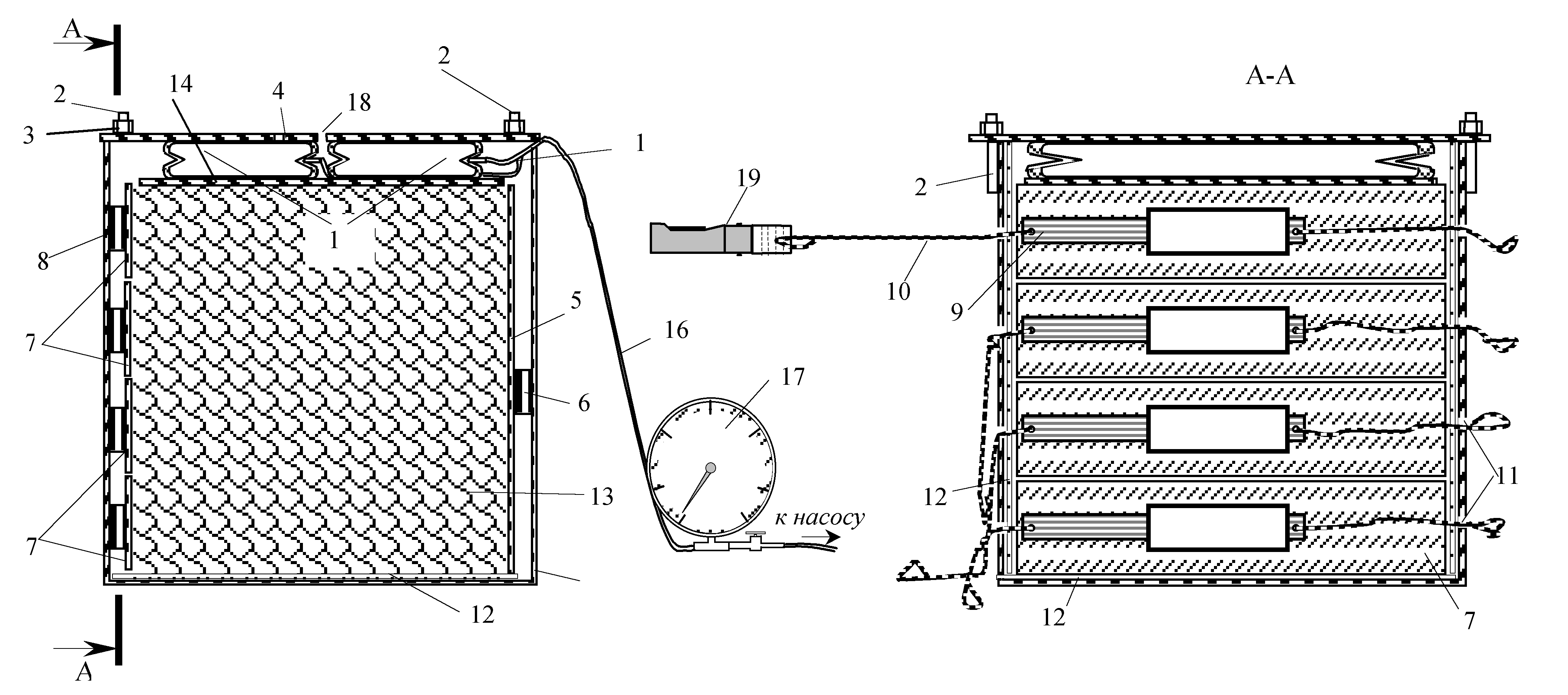 3 равномерно укладывался исследуемый материал 13, сверху которого горизонтально располагался металлический лист 14 размерами 295´ 295´ 10 мм. На лист улаживались два пневмобаллона 15, патрубки (16) от которых выводились наружу модели и были включены в единую пневмосистему с манометром (17) и насосом. После установки баллонов ящик закрывался крышкой, в которой находилось два отверстия 18 диаметром 8 мм, через которые с помощью штангенциркуля определялась текущая высота породы в момент отработки модели. Протяжка полотен датчиков осуществлялась динамометром ДОСМ 3-02 (19).В модель засыпалась порода, взятая из почвы выемочной выработки проведенной по пласту с