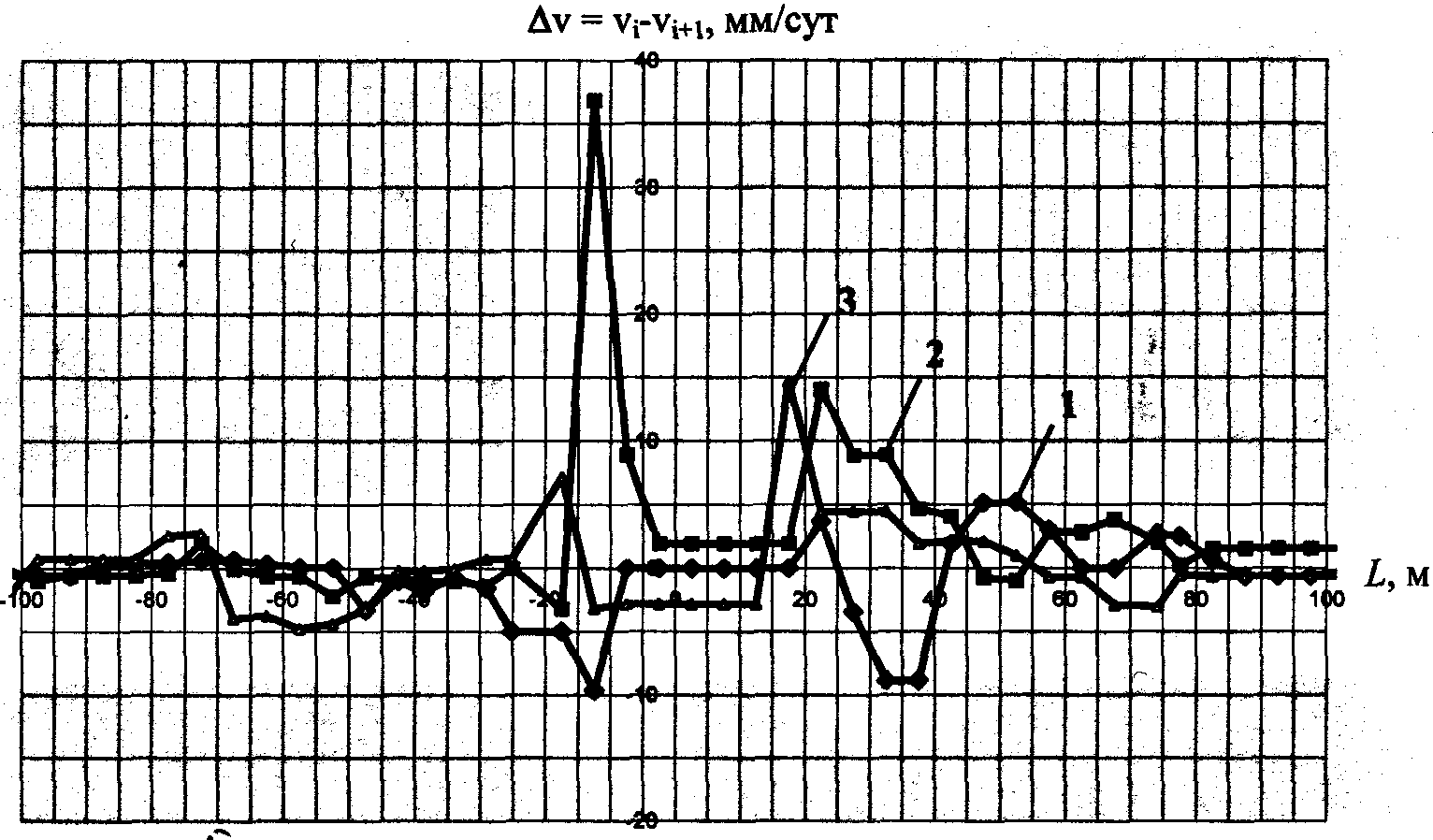 Рис.4 График зависимости разности скоростей смещений кровли выработки на соседних комплектах крепи от расстояния между замерной станцией и лавой (1 - 3-й экспериментальный участок, 2 – контрольный участок, 3 – 2-й экспериментальный участок)