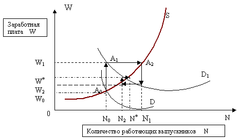 Исходное состояние (N0 , W0 ) - в точке А0, затем произошел сдвиг кривой спроса на финансистов от D до D1. Это привело к повышению заработной платы от уровня W0 до W1 и достижению равновесия рынка труда в точке А1, в которой пересекаются предложение финансистов N0 и новая кривая спроса на них D1. После расширения подготовки финансистов предложение их услуг на рынке труда повышается до N1. В результате заработная плата финансистов снижается до уровня W2,что приводит через несколько лет к сокращению подготовки финансистов и их нехватке на рынке труда. Снижение предложения до уровня N2 влечет повышение заработной платы финансистов до уровня большего W*. что создает дополнительные стимулы для расширения их подготовки.