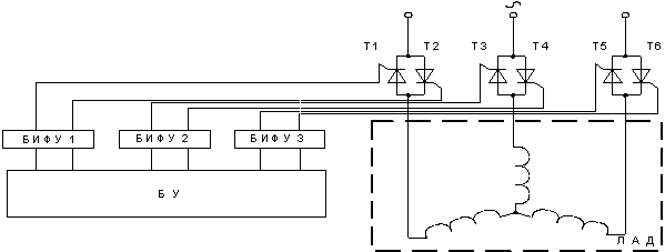 Такой режим можно реализовать при помощи трехфазного тиристорного регулятора напряжения (рисунок 3.1) с блоками управления.