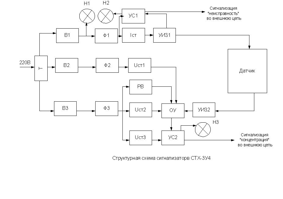 ПРЕДПОСЫЛКИ СОЗДАНИЯ ЭЛЕКТРОННОЙ СИСТЕМЫ КОНТРОЛЯ СОСТОЯНИЯ ВОЗДУШНОГО БАССЕЙНА ДОНЕЦКОГО КОКСОХИМЗАВОДА Алдохіна А.С., Предпосылки создания єлектронной системы контроля состояния воздушного бассейна Донецкого коксохимзавода.-Збірка студентських наукових праць факультету КІТА ДонНТУ. Випуск 1. - Донецьк: ДонНТУ 2003.-266с. Одной из глобальных проблем человечества является оценка экологического состояния окружающей среды и влияния научно- технического прогресса на экологическую обстановку промышленных регионов. Для Донецкой области особенно актуален вопрос о состоянии воздушного бассейна коксохимических заводов. Существуют стационарные химико-технологические средства контроля выбросов вредных газов в атмосферу. В настоящее время большое распространение получают системы экспресс-анализа, проводящие измерения с заданной частотой и точностью. Поскольку контроль за концентрацией всех возможных вредных веществ (ВВ) невозможен, то в каждом регионе (области, городе) составляется свой перечень анализируемых ВВ, определяемый особенностями имеющихся предприятий. Существует, однако, перечень соединений, подлежащих определению везде: диоксины, хлорированные бифенилы, полиароматические углеводороды и т.д. Концентрация их контролируется промышленным автоматическим термохимическим сигнализатором типа СТХ-ЗУ4 до взрывоопасных концентраций (см.рис.1). В состав сигнализатора входят: блок питания и сигнализации БПС-107У4, датчик ДТХ-107У4 или ДТХ-108У4 [1]. Датчик служит для преобразования неэлектрической величины (концентрации горючих веществ в воздухе) в электрический сигнал постоянного тока. С датчика через УИ32 сигнал поступает на операционный усилитель (ОУ). При равенстве напряжения сигнала и напряжения стабилизатора UCT2 на выходе ОУ напряжение скачком меняет полярность, при этом узел сигнализации выдаёт сигнализацию «концентрация» во внешнюю цепь и загорается лампа НЗ.