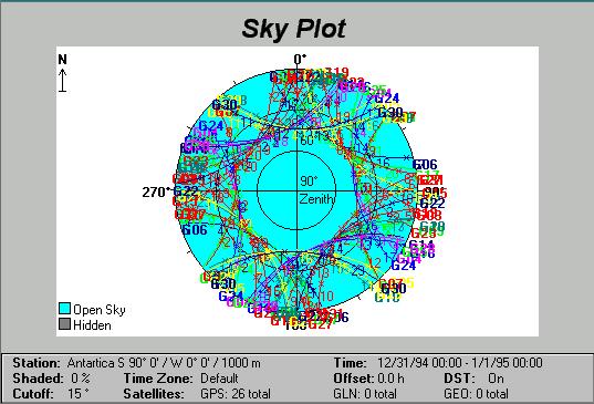 How to best use skyplots during reconnaissance? While GPS manufacturers software can generate the plots, it is not convenient to go into the field with a computer and printer! A compromise is therefore to use a manual method based on a series of skyplots (generated for a representative site such as the centroid of the network), for each hour. At each site the obstructions can then be mapped, and if there are a significant number of potential signal obstructions, they may be visually compared with the various one hour skyplots and the best tracking period selected (that with the minimum obstructions).