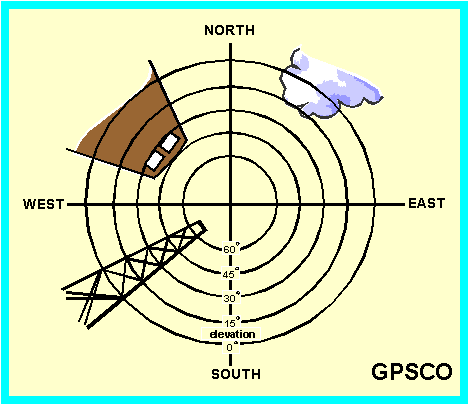 Skyplots can be used during reconnaissance to ensure that the satellite signals from the selected satellites can be acquired by the receiver. The obstructions at a site can be plotted on a zenith plot independently of a skyplot as in Figure 2 (or a photograph of the zenith could be taken with a fish-eye lens!), and during the survey planning stage a decision can be made on which satellites to be tracked at the sites by comparing Figures 1 and 2 (remembering that only common satellites between sites are useful!). Skyplots annotated with possible obstructions are also useful during actual data tracking because if the data quality is poor (as indicated by the signal-to-noise ratio displayed by the receiver during operation), the possible source of interference can be identified and an appropriate note made to assist subsequent data processing.