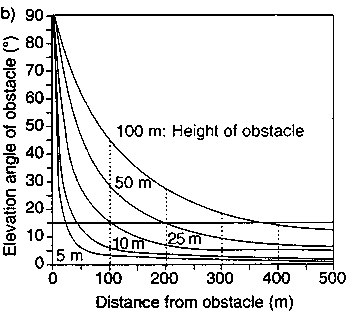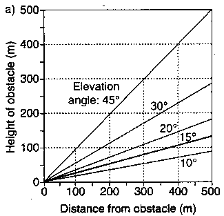 How may the obstructions be mapped during reconnaissance? The basic tools are a compass and a clinometer, and every field party should be equipped with them. However, if the site location has not yet been fixed with certainty, as may be the case with sites in urban environments, the reconnaissance assumes greater importance. As there may be many candidate locations for each site, some shortcut techniques should be considered. For example, keep several graphs handy that relate distance to and height of a potential obstruction, to the elevation angle that it subtends (see Figure 3). Efficient reconnaissance techniques can be developed if the heights of buildings and trees are known, and distances are easily measured using, for example, a handheld laser rangefinder.