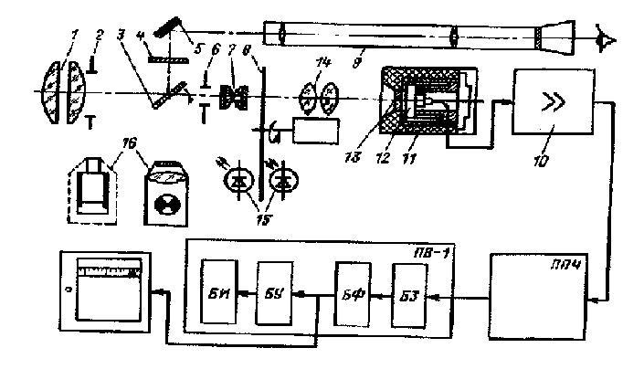 Пирометр (рис.1) включает датчик (PbS-фоторезистор), промежуточный преобразователь, измерительный преобразователь и при необходимости самопишущий потенциометр. Объектив 1 создает изображение объекта измерения в плоскости полевой диафрагмы 6, размеры которой определяют поле зрения прибора. Коллективные линзы 7 создают изображение апертурной диафрагмы 2 в плоскости диска модулятора 8, которое линзами 14 проектируется в плоскость приемника излучения 12. Приемник 12 и светофильтр 13 находятся в термостате 11. Предусилитель 10 усиливает переменный сигнал приемника излучения. Система синхронизации 15, состоящая из пары светодиод-фотодиод, обеспечивает работу синхродетектора. В качестве источника сравнения 16 используется лампочка с вольфрамовой нитью. Визирная система пирометра, обеспечивающая наведение датчика на объект, состоит из окуляра 9, неподвижного зеркала 5, матового стекла 4 и подвижного зеркала 3.