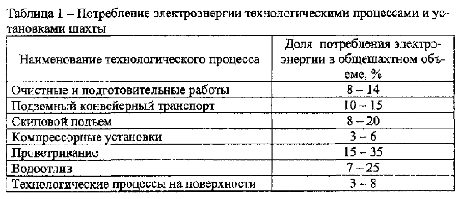 Согласно исследованиям [2], структура потребления электроэнергии технологическими процессами и установками шахты приведена в таблице 1.