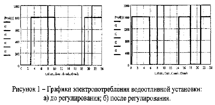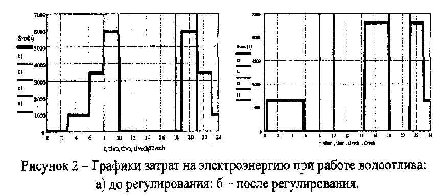 В первом случае (рис. 1, а) откачка воды производится одним насосом, а во втором (рис. 1,6) - двумя, с выключением насосных агрегатов на время вечернего максимума. На графиках вертикальными линиями показаны границы зон с максимальной стоимостью электроэнергии. Расчеты показывают, что при таком регулировании экономия денежных средств составляет порядка 10 тыс. грн. Наиболее современной аппаратурой автоматизации главных водоотливных установок является аппаратура ВАВ.1М [4], одной из функций которой является коррекция рабочего режима насоса с учетом периода максимума энергопотребления или периода максимальной стоимости электроэнергии.