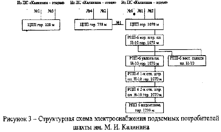 В соответствии с вышеизложенным, разработана структурная схема автоматизированной системы управления электроснабжением (АСУЭШ) шахты им. М.И. Калинина ГП «Донецкая угольная энергетическая компания». Структурная схема электроснабжения подземных потребителей шахты представлена на рис. 3, где обозначено: ЦДЛ - центральная подземная подстанция; РПП-6 - высоковольтный распределительный подземный пункт.