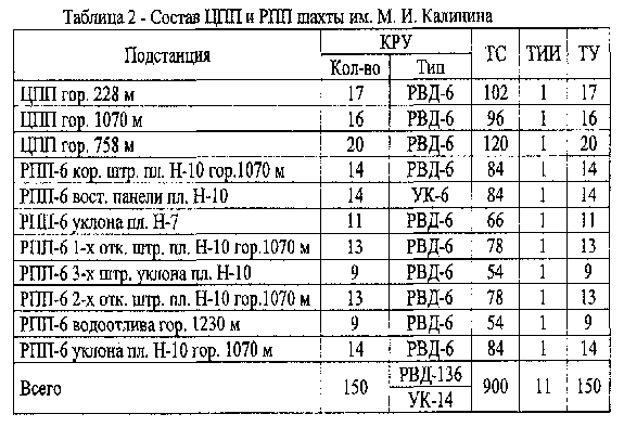 Состав ЦПП и РПП шахты приведен в таблице 2, где также определено необходимое количество сигналов телесигнализации (ТС), телеизмерения (ТИИ) и телеуправления (ТУ).