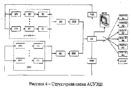 Структурная схема системы АСУЭШ приведена на рисунке 4, где КРУ - комплектное распределительное устройство; ИП - измерительный преобразователь расхода электроэнергии подземным электропотребителем; БСЗ - блок согласования и защиты; СЭ - счетчик расхода электроэнергии потребителями поверхности шахты; ГПП - главная поверхностная подстанция; МК - микроконтроллер; БПИ - блок передачи информации; ПК - промышленный компьютер; УПИ - устройство передачи команд управления на изменение состояния КРУ; МЭД - мнемосхема энергодиспетчера; ВАВ.1М №1 - аппаратура автоматизации насосной станции водоотлива гор.1250м; ВАВ.1М №2 - аппаратура автоматизации насосной станции водоотлива гор. 1070м; ВАВ.1М №3 - аппаратура автоматизации насосной станции водоотлива гор.758м; ВАВ.1М №4 - аппаратура автоматизации насосной станции водоотлива гор.229м; УКАВ.М №1 - комплектное устройство автоматического управления вентиляторной установкой типа ВЦ-5 скипового ствола, оборудованной системой асинхронно-вентильного каскада; УКАВ.М №2 -комплектное устройство автоматического управления вентиляторной установкой типа ВЦД-47У восточного вентиляционного ствола, оборудованной системой асинхронно-вентильного каскада; САУКЛ - система автоматизации конвейерной линии от 2-й восточной лавы пласта h10.