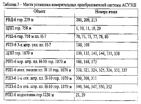 В качестве измерительных преобразователей ИП рекомендуется принять устройства типа УКЭШ [1], однако они могут быть использованы только для целей технического учета расхода электроэнергии. В настоящее время измерительные преобразователи коммерческого учета для подземных электропотребителей отечественной промышленностью не выпускаются. Места установки измерительных преобразователей приведены в таблице 3. В качестве счетчиков расхода электроэнергии СЭ потребителями поверхности шахты могут быть приняты любые серийно выпускаемые датчики, имеющие выход для подключения к ЭВМ, например, счетчики типа ЕвроАльфа.