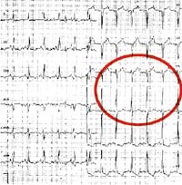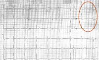 На ЭКГ до приступа выявляются признаки перенесенного очагового поражения нижней и, по-видимому, перегородочной локализации и отрицательные з. Т V5-V6. На ЭКГ во время болевого приступа зарегистрирована элевация сегмента ST в отведениях V3-V4 с максимальными изменениями в отведении V3, где подъем сегмента ST составил 5 мм. Если сравнить данные изменения с ЭКГ-12, зарегистрированной до приступа болей, то становится очевидным, что ни в отведении V1, отражающем сагиттальное направление, ни в отведении V5, отражающем изменения по горизонтальной оси, ни в третьем и AVF отведениях, отражающих вертикальное направление, динамики ЭКГ не выявляется. Таким образом, в данном случае лишь использование 12-осевой системы отведений ЭКГ позволило диагностировать ишемические изменения миокарда.