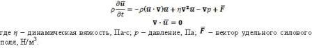 Это уравнение должно решаться совместно с уравнениями Навье-Стокса, которые векторном виде для несжимаемой ньютоновской жидкости записываются следующим образом:
