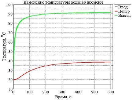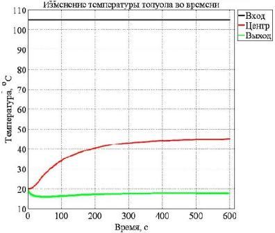 При моделировании теплообменника типа "труба в трубе" были учтены гидродинамические особенности потоков. При заданных входных температурах потоков получено распределения температуры по длине теплообменника. Толуол охлаждается до 17,81°С, а вода при этом достигает температуры 91,43°С на выходе из теплообменника. Построены кривые изменения температур во времени для толуола и воды на входной и выходной границах в теплообменник и в его центральной части. Из графиков видно, что в центральных областях теплообменника выход на стационарный режим достигается за более длительный промежуток времени, чем на его границах.