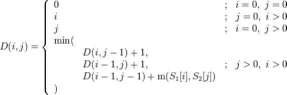 Расстояние Левенштейна или расстояние редактирования - это минимальное количество операций (вставки одного символа и замены одного символа на другой), необходимых для преобразования одной строки в другую [1]. Расстояние Левенштейна применяют для исправления ошибок в словах, биоинформатике для сравнения хромосом и для полнотекстового поиска. Данная метрика имеет следующие недостатки: