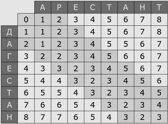 Итоговое расстояние между словами «дагестан» и «арестант» будет равно 3.