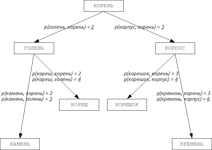 При оптимизации нечеткого поиска часто возникает вопрос по организации данных таким образом, чтобы поиск выполнялся быстрее и тратил меньше ресурсов. Одним из вариантов подобной организации данных служат деревья В. Буркхарда и Р. Келлера (BK-деревья). Данные деревья строятся на основании метрик Левенштейна или Даме- рау-Левенштейна. Пример такого дерева представлен на рис. 4.