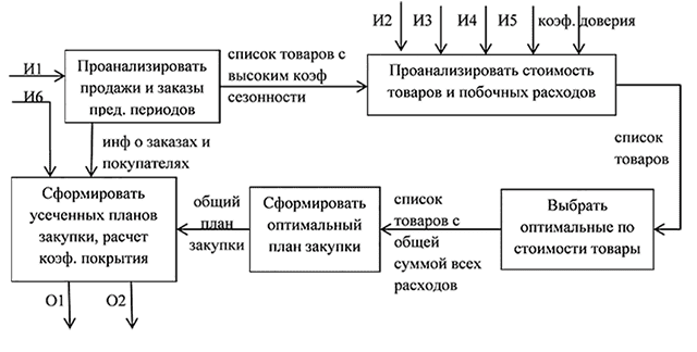 Рисунок 4.1–Модель типа Черный ящик На основе фактора И1 программой, ведущей финансовый учет на предприятии, путем анализа продаж предыдущего периода определяется количество товаров необходимых к закупке. Расчеты могут осуществляться при помощи XYZ/ABC-анализа, модели нечеткой логики или более простых методов анализа. Факторы И3, И4, И5 – вместе определяют сумму побочных расходов при покупке товара. И2 – денежный показатель закупочной цены товара, который в комбинации с побочными расходами определяет оптимальный в ценовой политике товар (с наименьшей закупочной стоимостью и ценой сопровождающих расходов на доставку, оформление и т.д.). Т.е. из всех производителей выбирается тот, у кого цена товара и сопутствующие расходы ниже (если таких несколько – выбирается тот, с кем чаще работало предприятие) и так с каждым товаром. При этом существуют непредвидимые человеческие факторы в работе с поставщиками, поэтому введен коэффициент доверия каждому (который по желанию пользователя можно отключить) [12]. Чаще всего на предприятии возникает ситуация с нехваткой бюджета на закупку товаров, поэтому в модель введен фактор И6, который позволяет ограничивать список закупаемых товаров. Выходной показатель О1 – представляет собой коэффициент, необходимый в случае нехватки бюджета и неспособности покрыть спрос (он связан с особенностями работы с отсроченными платежами) – он показывает насколько разработанный план закупок покрывает потребности того или иного покупателя. Данный коэффициент позволит пользователю самому определять, какой из разработанных планов закупки наиболее актуален для предприятия в данный момент (это зависит от условий договоров с покупателями, отчетными периодами и тд.) [13-14]. На рисунке 4.2 представлена обобщенная структурная схема системы планирования закупок.   Рисунок 4.2 – Обобщенная структурная схема системы планирования закупок Данная модель универсальна, так как аппарат нечеткой логики позволяет настраивать переменные под любые условия и учитывать форс-мажорные обстоятельства. Нечеткими переменными в данной модели можно считать: объемы закупки, зависящие от продаж предыдущих периодов, оптимальность цен товаров и сопутствующих расходов, зависящие от поставщиков, а также коэффициент покрытия. Помимо этого выбор оптимального плана закупки, где происходит объединение закупочных цен и побочных расходов – тоже определяет нечеткая модель. Примером форс-мажорного обстоятельства может быть увеличение фактора И5 в случае закупки консолидированного груза при задержке какого-то опоздавшего товара (за счет увеличения срока хранения остальных товаров) [15].