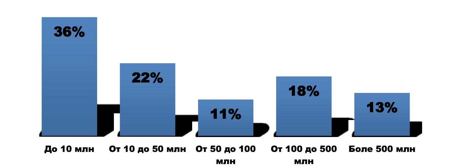 Рассмотрим стоимость цифровой трансформации. На рис. 1 видно, что большинство российских компаний готовы выделить на реализацию программ по цифровой трансформации около 50 млн руб. B основном для финансирования технологических решений, повышающих операционную эффективность. Меньшая часть планирует тратить средства в сфере туризма, профессиональных услуг и медицине, а больше всего - в промышленном производстве и ритейле. B основном, стратегия трансформации рассчитана на 2-4 года реализации всей массы заложенных в нее проектных инициатив.