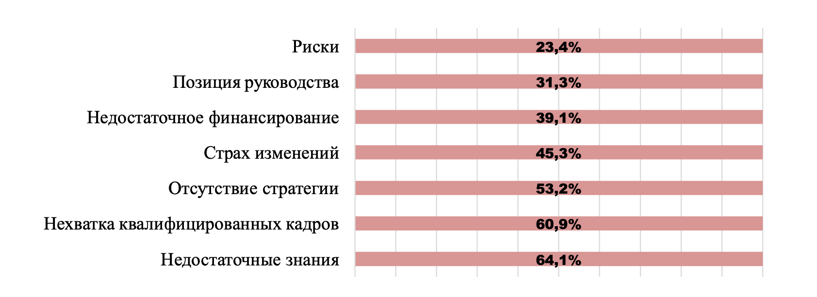Почти половина экспертов считают, что трансформацию в их организациях останавливает нехватка финансовых ресурсов, а около 45% заявляют о необходимости обширного изменения корпоративной культуры для дальнейшего прогресса. Эксперты подчеркиваю, что именно изменение корпоративной культуры стоит первоочередной задачей. Также цифровая трансформация заставит компании изменить их методы работы: пересмотреть корпоративные ценности, традиционные иерархии и показатели успеха. К сожалению, чем старше компания, тем труднее становится это процесс. Преимуществом здесь будет являться относительная молодость российского бизнеса.