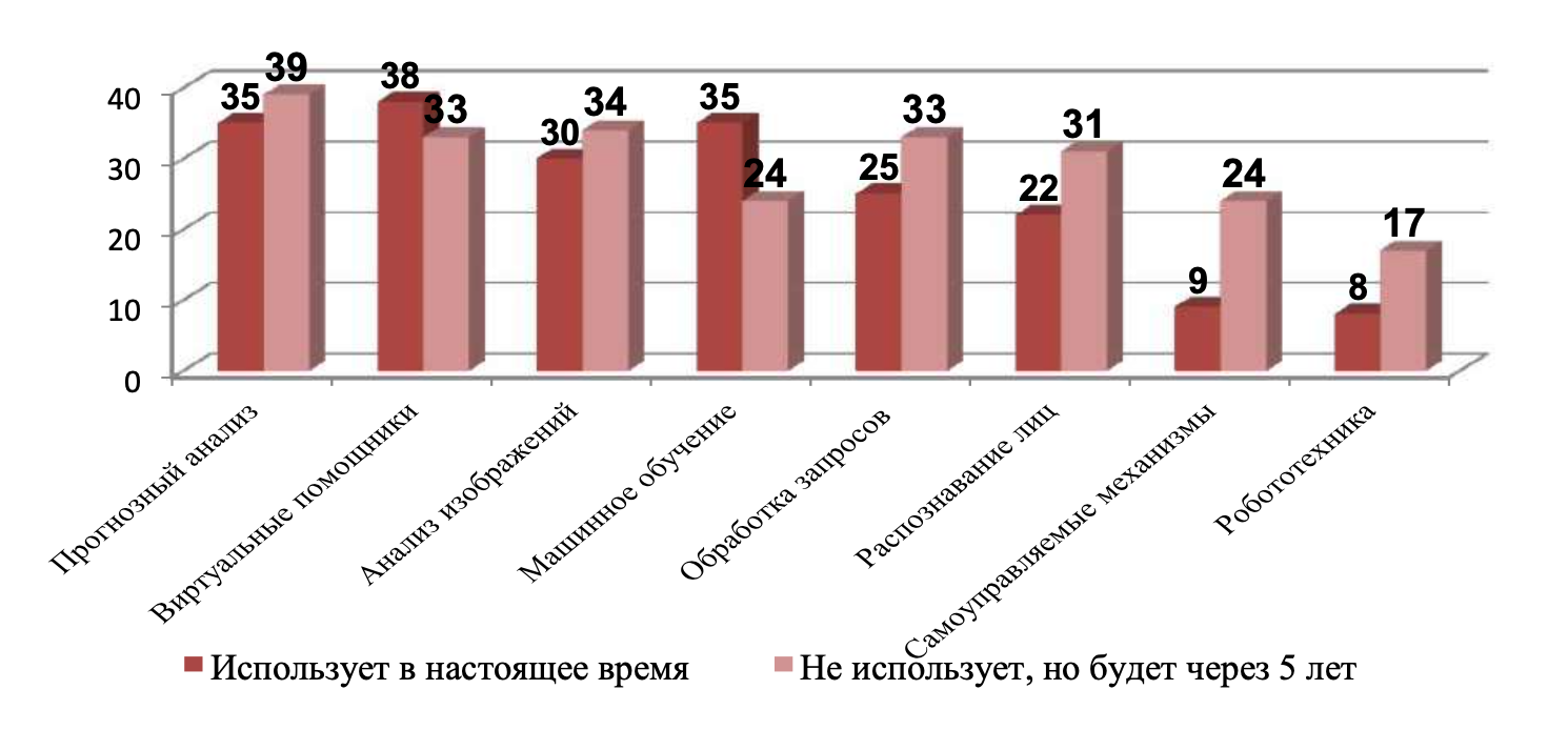 По результатам исследования НИУ ВШЭ на сегодняшний день наиболее часто используемыми среди технологий ИИ в России являются виртуальные помощники (38 %), прогнозный анализ и машинное обучение (по 35 %) (рис. 3).